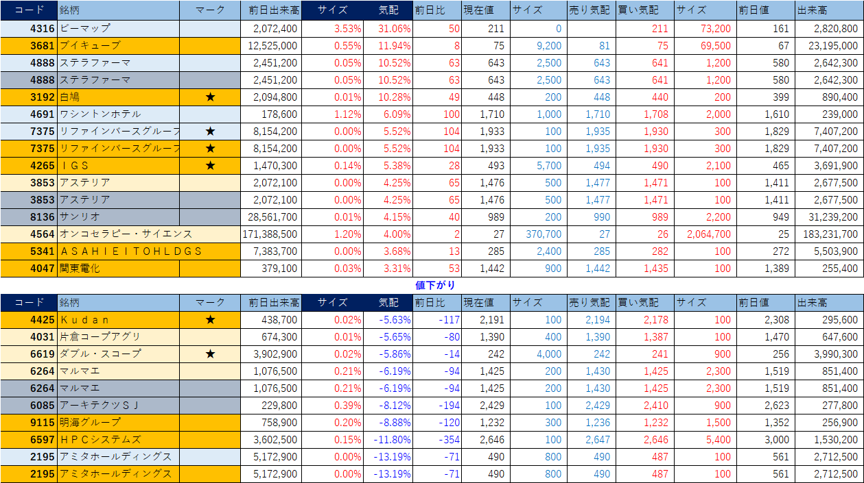 ホット銘柄-上げ銘柄&下げ銘柄(2026/04/07-大引け後) 投稿日: 2026年4月7日2026年4月7日 投稿者: h_nagahama 「★」は昨日時点で注目した銘柄、「値上がり」にあれば伸びており、「値下がり」にあれば押しを形成している可能性。※銘柄の重複はお気にされずに。