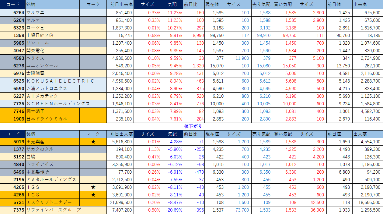 ホット銘柄-上げ銘柄&下げ銘柄(2026/04/08-前引け後) 投稿日: 2026年4月8日 投稿者: h_nagahama 「★」は昨日時点で注目した銘柄、「値上がり」にあれば伸びており、「値下がり」にあれば押しを形成している可能性。※銘柄の重複はお気にされずに。