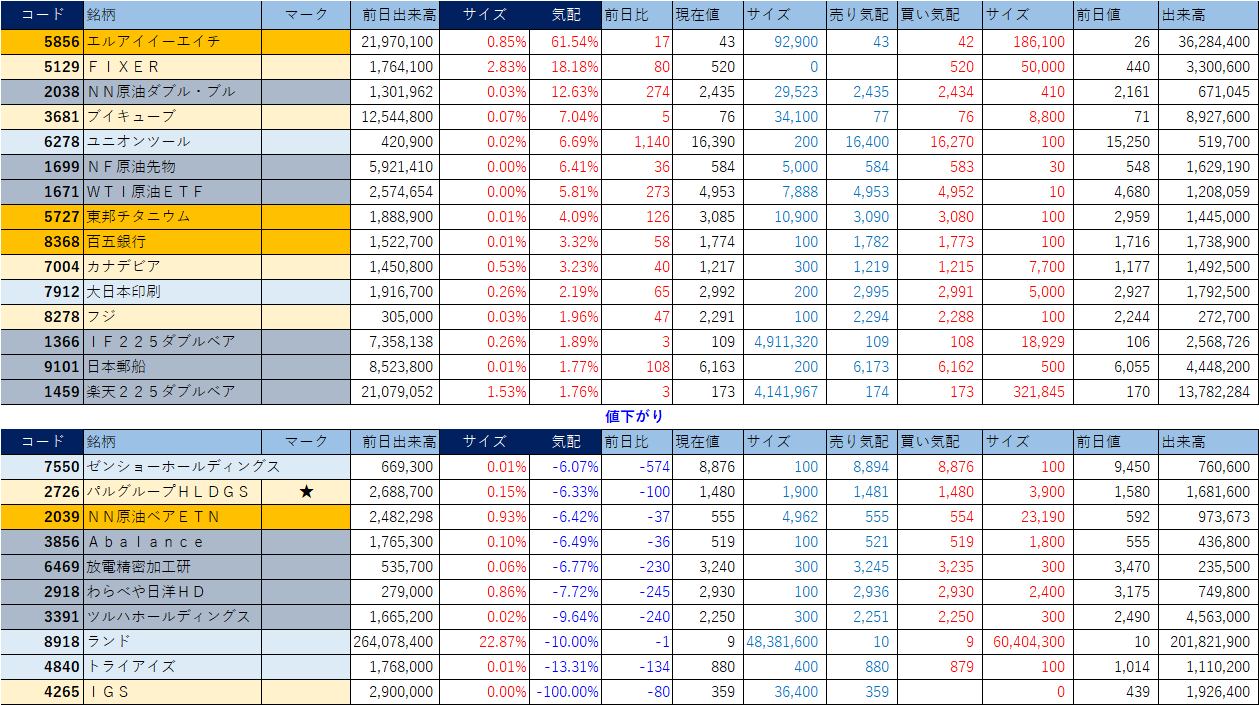 ホット銘柄-上げ銘柄&下げ銘柄(2026/04/09-大引け後) 投稿日: 2026年4月9日2026年4月9日 投稿者: h_nagahama 「★」は昨日時点で注目した銘柄、「値上がり」にあれば伸びており、「値下がり」にあれば押しを形成している可能性。※銘柄の重複はお気にされずに。