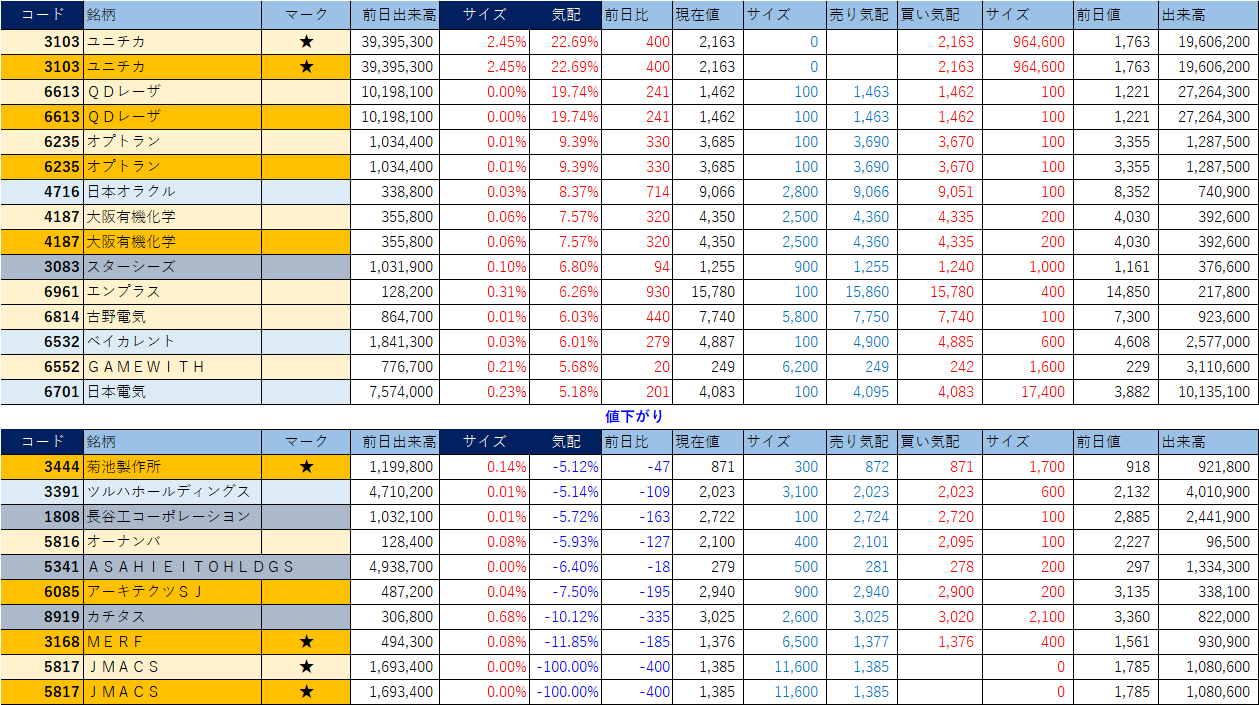 「★」は昨日時点で注目した銘柄、「値上がり」にあれば伸びており、「値下がり」にあれば押しを形成している可能性。※銘柄の重複はお気にされずに。