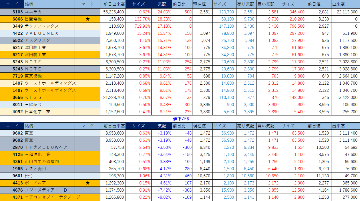 「★」は昨日時点で注目した銘柄、「値上がり」にあれば伸びており、「値下がり」にあれば押しを形成している可能性。※銘柄の重複はお気にされずに。