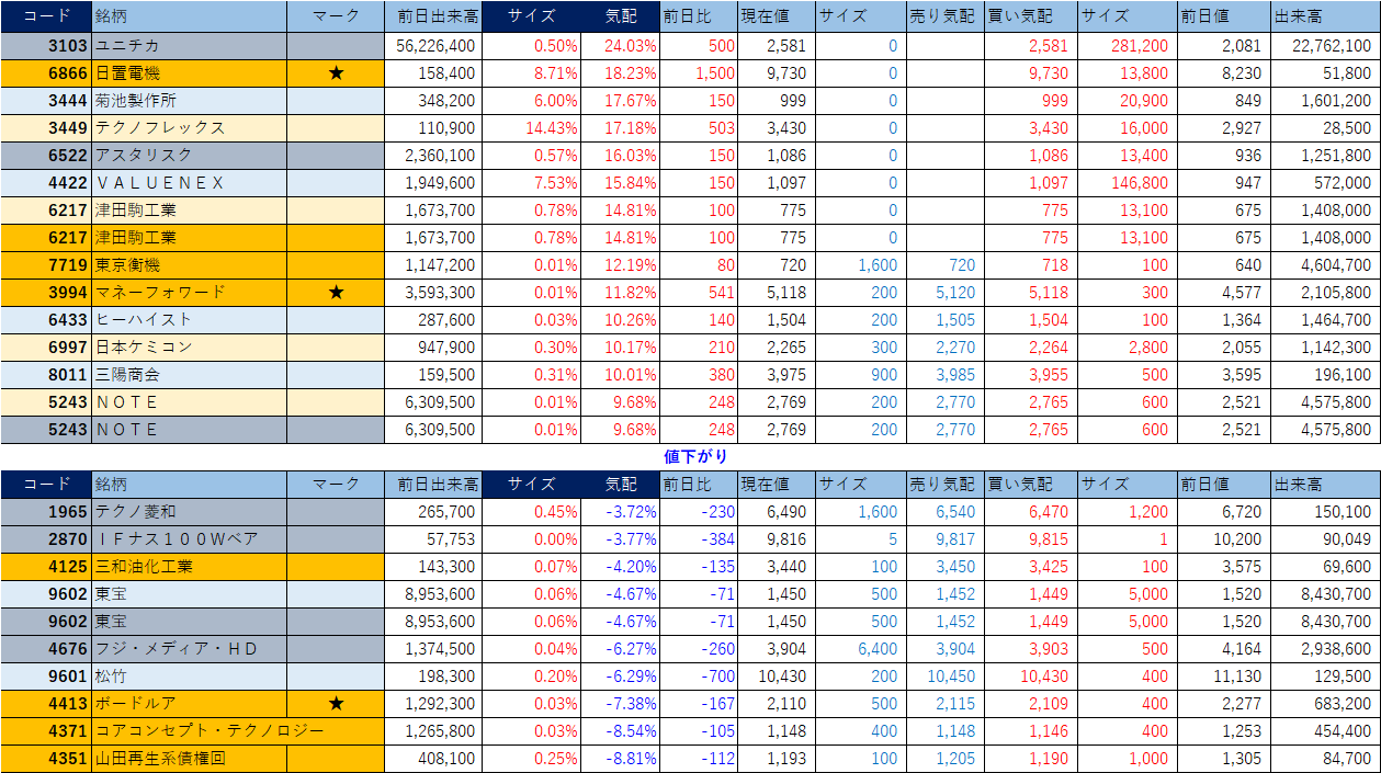 ホット銘柄-上げ銘柄&下げ銘柄(2026/04/16-大引け後) 投稿日: 2026年4月16日2026年4月16日 投稿者: h_nagahama 「★」は昨日時点で注目した銘柄、「値上がり」にあれば伸びており、「値下がり」にあれば押しを形成している可能性。※銘柄の重複はお気にされずに。