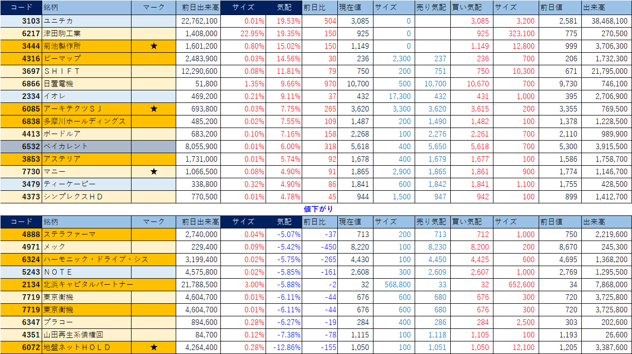ホット銘柄-上げ銘柄&下げ銘柄(2026/04/17-大引け後) 投稿日: 2026年4月17日2026年4月17日 投稿者: h_nagahama 「★」は昨日時点で注目した銘柄、「値上がり」にあれば伸びており、「値下がり」にあれば押しを形成している可能性。※銘柄の重複はお気にされずに。