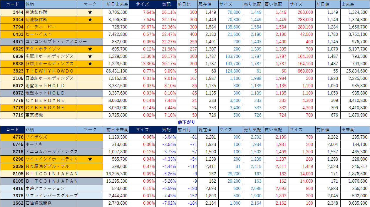ホット銘柄-上げ銘柄&下げ銘柄(2026/04/20-前引け後) 投稿日: 2026年4月20日 投稿者: h_nagahama 「★」は昨日時点で注目した銘柄、「値上がり」にあれば伸びており、「値下がり」にあれば押しを形成している可能性。※銘柄の重複はお気にされずに。