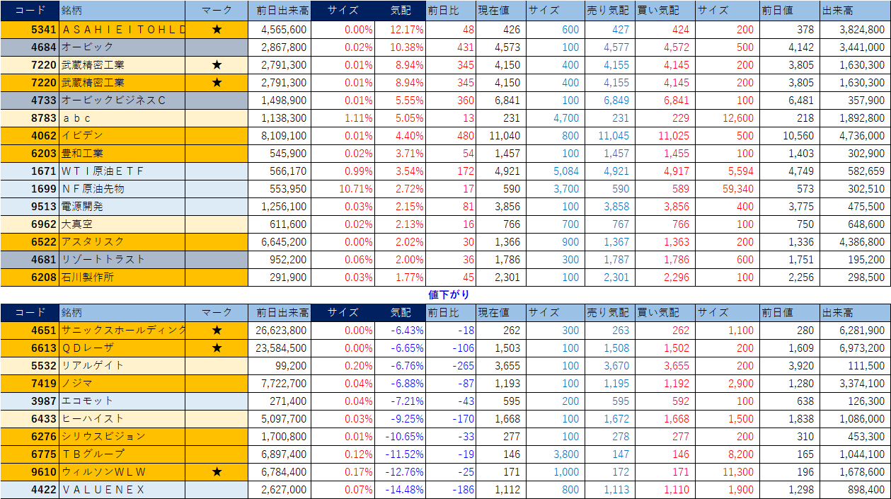 「★」は昨日時点で注目した銘柄、「値上がり」にあれば伸びており、「値下がり」にあれば押しを形成している可能性。※銘柄の重複はお気にされずに。