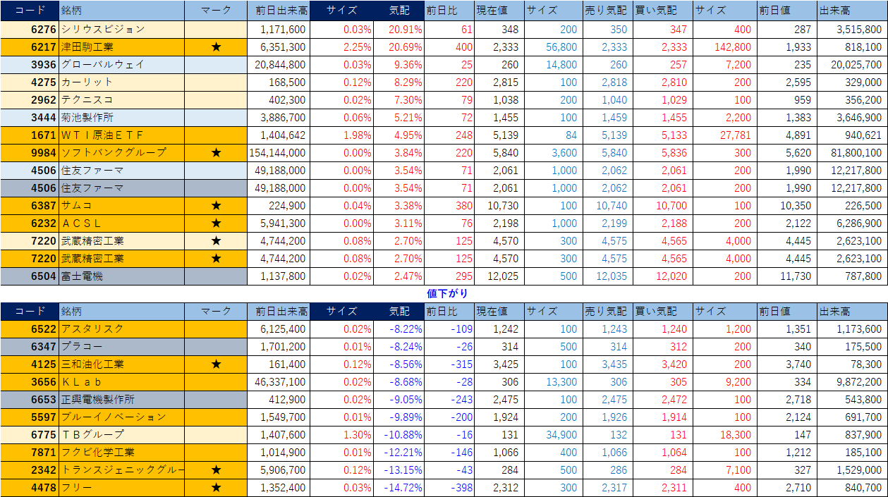ホット銘柄-上げ銘柄&下げ銘柄(2026/04/23-前引け後) 投稿日: 2026年4月23日 投稿者: h_nagahama 「★」は昨日時点で注目した銘柄、「値上がり」にあれば伸びており、「値下がり」にあれば押しを形成している可能性。※銘柄の重複はお気にされずに。