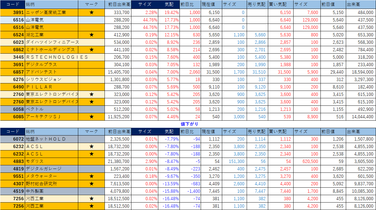 「★」は昨日時点で注目した銘柄、「値上がり」にあれば伸びており、「値下がり」にあれば押しを形成している可能性。※銘柄の重複はお気にされずに。