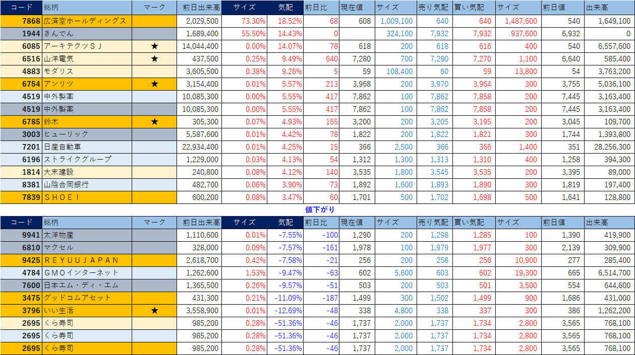 「★」は昨日時点で注目した銘柄、「値上がり」にあれば伸びており、「値下がり」にあれば押しを形成している可能性。※銘柄の重複はお気にされずに。